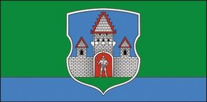 Описание: В голубом поле барочного щита на зелёной оконечности изображена серебряная крепость с тремя башнями, средняя из которых выше боковых. В центре средней башни – красные ворота с серебряным рыцарем, вооружённым копьём в правой руке.